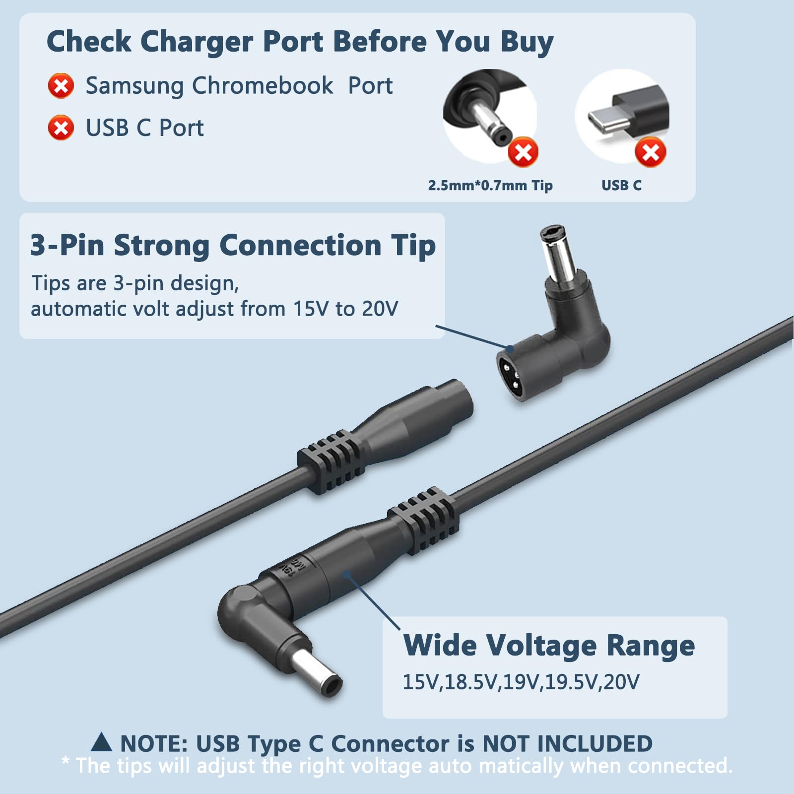 - Wide output voltage: 15V-20V, Input Voltage: Worldwide 100-240V, 50 - 60Hz. Output Voltage: DC 15V, 16V, 18. 5V, 19V, 19. 5V, 20V, 16 Connector Types. Perfectly Compatible with 90W 75W 70W 65W 45W 40W 33W Laptops. Each brand laptop has several different kinds of tips for different models. If you are not sure your laptop tip size, Please send your laptop brand and model number to us before buying