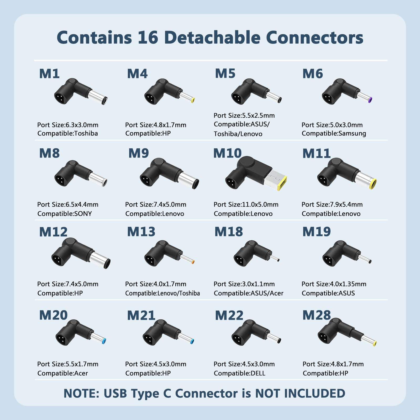 - Package Content: 1x 90W ELECBRAIN Universal Laptop Charger, 16 DC Connector Plugs.Attenion: USB Type C and 2.5*0.7mm Connector is NOT INCLUDED, 1x US Power Supply Cord, 1xUser Manual Notes: ELECBRAIN laptop charger is NOT compatible with all notebook models. Please make sure that your laptop's Rated Wattage is less than or equal to 90 Watts. For connector specification, please refer to the connector image